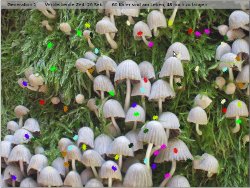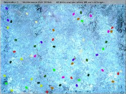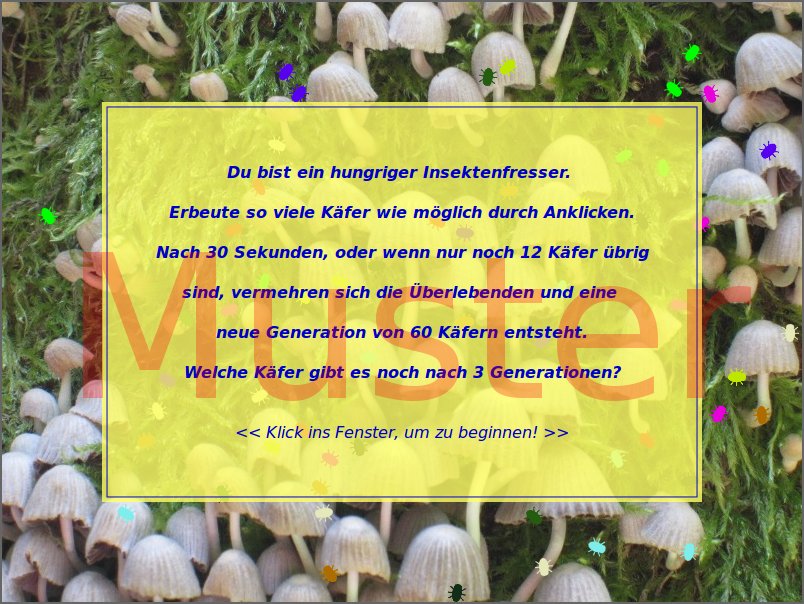 Übersicht | Camouflage | Watchmaker | Shell Space CamouflageDie Benutzer/innen jagen per Mausklick oder Fingertipp farbige Käfer auf optisch markanten Untergründen. Nach einer Weile reproduzieren sich die überlebenden Käfer und die Spieler gehen erneut auf die Jagd. Nach wenigen Durchgängen (Generationen) existieren nur noch die unscheinbarsten Käfer und für die Spieler/innen wird es zugleich immer schwieriger Beute zu machen.Online-DemonstrationEine Online-Umsetzung dieses Simulationsspiels finden Sie in unserem virtuellen Museum "Evolution in Aktion". AnleitungEs handelt sich um ein Such- und Klickspiel, das mit einer Maus gespielt wird, oder besser noch, mit den Fingern auf einem großen Touchscreen.Vor einem markanten Hintergrundbild erscheint eine Anfangspopulation von Käfern in zehn Farben; von jeder Farbe gibt es gleich viele Käfer. Der Spieler hat eine gewisse Zeit um Käfer durch Anklicken zu "fressen". Danach reproduzieren sich die verbliebenen Käfertypen proportional ihrer Häufigkeit bis zur Anfangspopulationsstärke. Die Reproduktion erfolgt asexuell und mit identen Nachkommen. Die Eltern werden eliminiert und ihre Nachkommen verteilen sich wieder zufällig auf dem gleichen Hintergrundbild. Nach drei Generationen ist das Spiel zu Ende. In der Auswertung werden die Abundanzen in jeder Generation in Form der Käfergrößen veranschaulicht. Neue Spiele, auch über die Neustart-Taste, starten mit einem anderen Hintergrundbild. Momentan wechseln sich vier Hintergrundbilder ab. HintergründigesDieses Programm führt Groß und Klein spielerisch vor Augen, dass es beim Schlagwort "Survival of the Fittest" nicht um Kraft und Stärke geht, sondern um die Angepassheit eines Individuums an seine Umwelt. Oft zeigt sich auch, dass Glück eine wichtige Rolle spielen kann. Gerade bei so kleinen Populationen ist die vermeintlich bestangepasste Varietät mit etwas Pech rasch ausgelöscht, wenn die Individuen zufällig gerade am falschen Platz sind (Schlagwort: Gendrift).ScreenshotsEs handelt sich um Prototypen, die Designs und verwendeten Werte sind Beispiele und können bei Bedarf beliebig geändert werden.