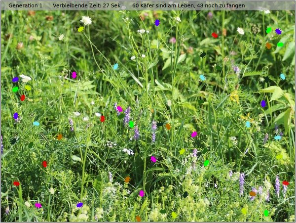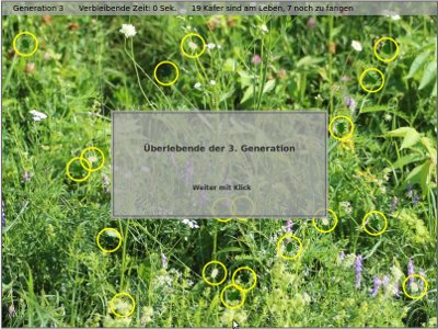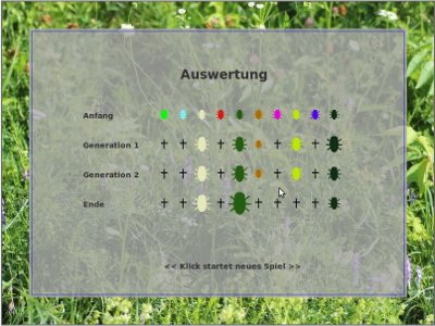 Ist die Zeit abgelaufen oder wurden genug Käfer gefressen, werden die überlebenden Käfer zur Verdeutlichung gelb markiert, danach erzeugen diese Käfer eine neue Generation von wiederum 60 Käfern nach ihrem Ebenbild. Jede verbliebene Farbe hat proportionalen Anteil an der neuen Generation. Die neuen Käfer werden wieder zufällig platziert und die Spieler können erneut danach klicken. Nach drei Generationen ist das Spiel zu Ende und es erscheint eine Auswertung wobei die Größe der dargestellten Käfer ihren Anteil in der jeweiligen Situation/Generation wiedergibt (Bild oben rechts; Kreuze bedeuten ausgestorben).
